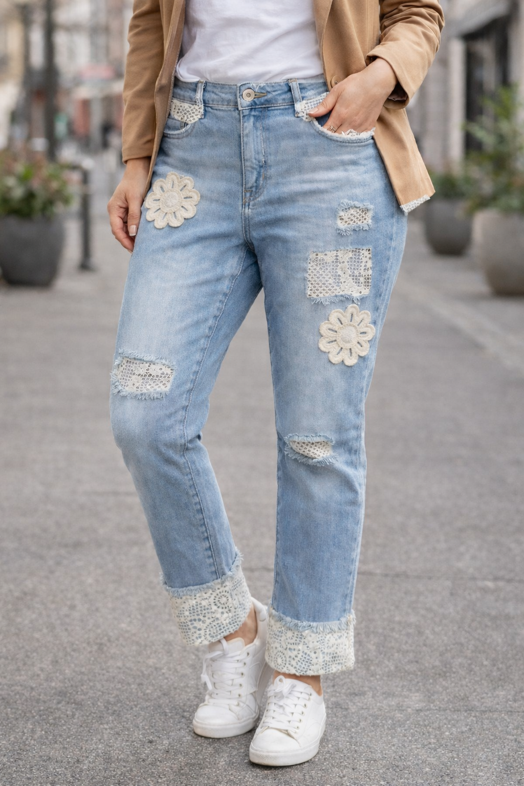 Zarte Spitzen-Details, liebevolle Blumen-Applikationen und ein angesagter Used-Look machen diese Jeans zu einem absoluten Boutique-Highlight.