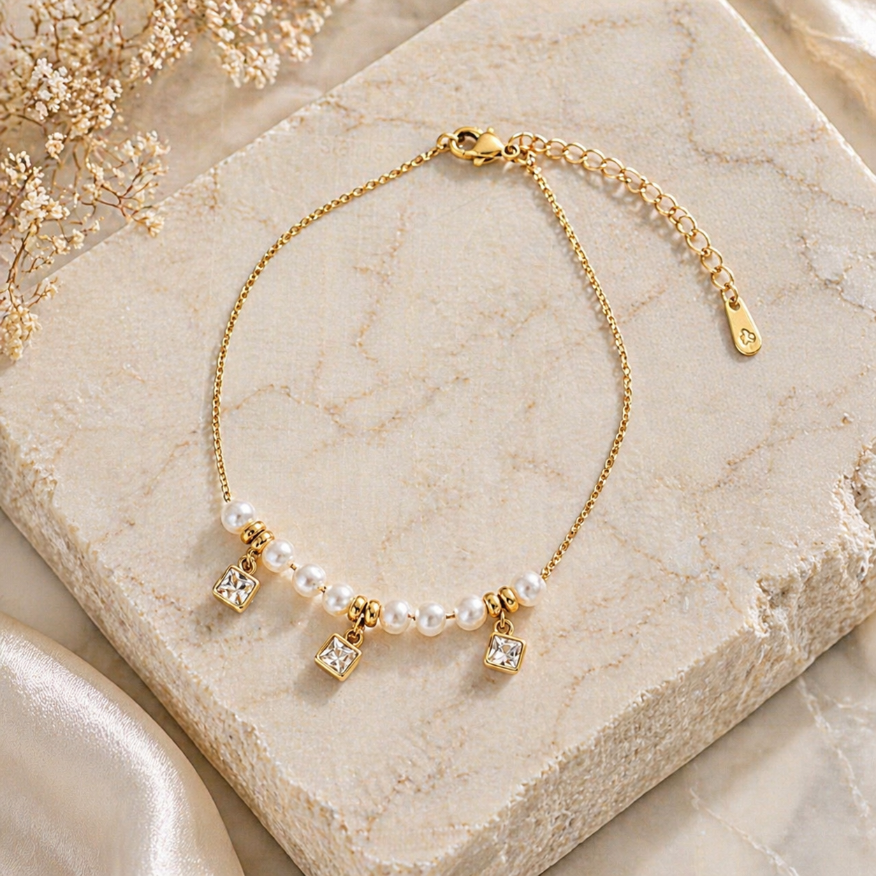 Dieses wunderschöne Fußkettchen vereint edle Perlen, funkelnde Details und hochwertige Materialien zu einem stilvollen Highlight. Die zarten Anhänger sorgen für einen eleganten Look, der dein Outfit sofort aufwertet.